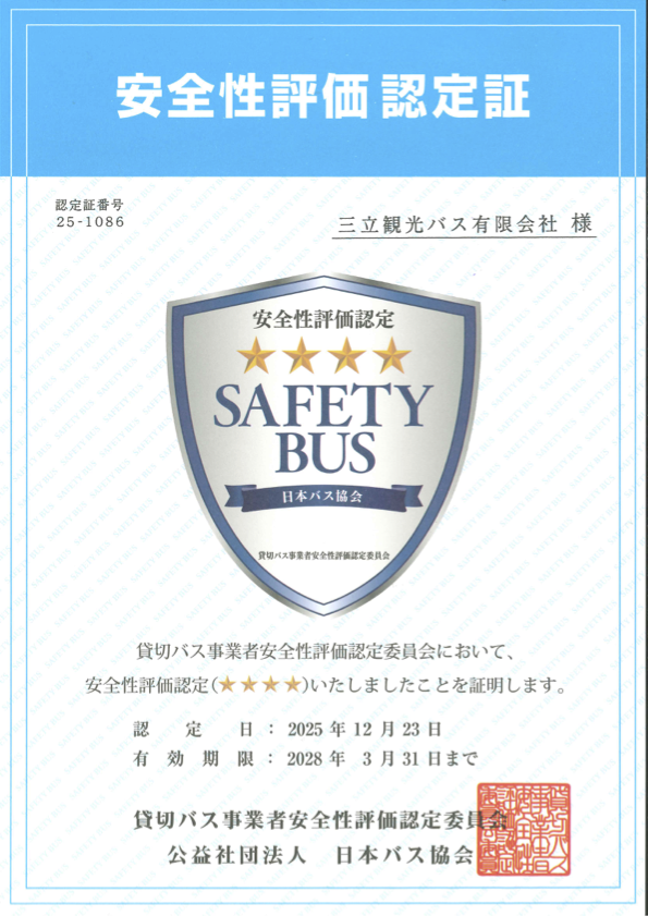 当社は貸切バス事業者安全性評価認定の最高ランクの四ツ星を取得 しています。